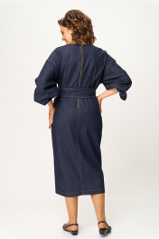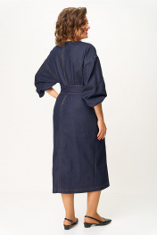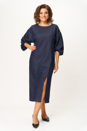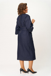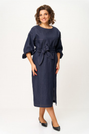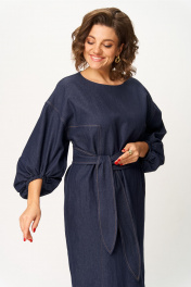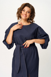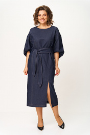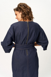 Стильное женское платье, выполнено из джинсовой ткани. Платье прямого силуэта, с отрезными бочками и разрезом по низу платья. Застежка на декоративную молнию в центральном шве спинки. Горловина круглая. Рукава со спущенной проймой. Рукав широкий, с асимметричным низом, собранным на резинку. В комплект входит пояс их основной ткани. Платье без подкладки.