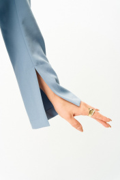 Элегантное женское платье, прилегающего силуэта: по переду и спинке вытачки по талии. Горловина круглая. Застежка на молнию в центральном шве спинки. Рукава втачные, двухшовные, расширенные к низу, в переднем шве, по низу, разрез. Платье без подкладки. Длина платья – 106 см Длина рукава – 62 см