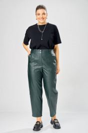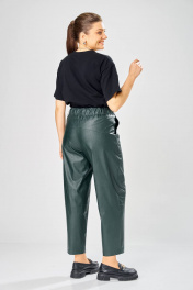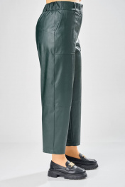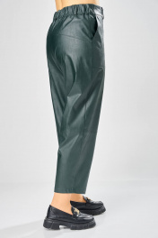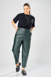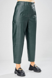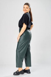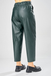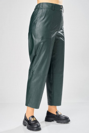 Длина брюк по боковому шву– 100 см Длина брюк по шаговому шву – 69 см Стильные женские брюки, из эко-кожи. Брюки, зауженные к низу, по передним половинкам накладные карманы, застежка по линии банта на молнию, на задних половинках отрезная кокетка и накладные карманы. Верх брюк на пояса с застежкой на кнопки.