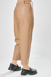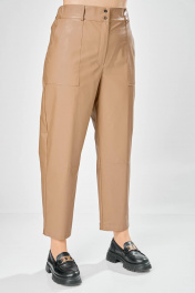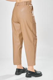 Длина брюк по боковому шву– 100 см Длина брюк по шаговому шву – 69 см Стильные женские брюки, из эко-кожи. Брюки, зауженные к низу, по передним половинкам накладные карманы, застежка по линии банта на молнию, на задних половинках отрезная кокетка и накладные карманы. Верх брюк на пояса с застежкой на кнопки.