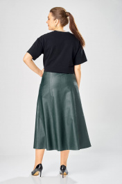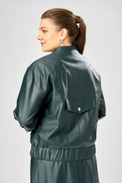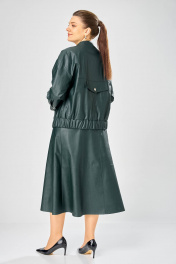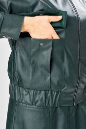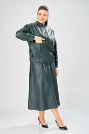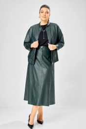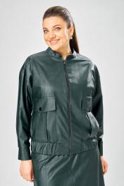 Длина куртки – 62 см Длина рукава – 50 см Длина юбки– 87 см Стильный женский комплект, выполнен из эко-кожи. Куртка свободного силуэта, застегивается на молнию, по переду накладные карманы с клапаном и декоративной кнопкой. Головина оформлена воротником стойка. По спинке отрезная кокетка с клапаном. Рукава со спущенной поймой, по низу притачной манжет с застежкой на кнопки. По низу куртки, притачная планка с резинкой. Куртка на подкладке. Юбка «А» образного силуэта, по переду и спинке рельефные швы, по переду от рельефа до бокового шва, карманы с листочкой, застежка на молнию в центральном шве переда. Верх юбки на поясе с застежкой на кнопки. Юбка на подкладке.