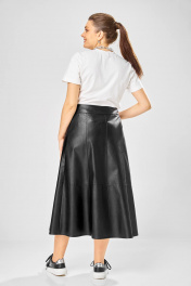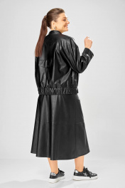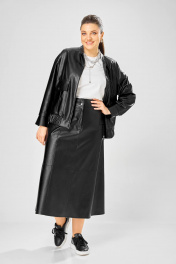 Длина куртки – 62 см Длина рукава – 50 см Длина юбки– 87 см Стильный женский комплект, выполнен из эко-кожи. Куртка свободного силуэта, застегивается на молнию, по переду накладные карманы с клапаном и декоративной кнопкой. Головина оформлена воротником стойка. По спинке отрезная кокетка с клапаном. Рукава со спущенной поймой, по низу притачной манжет с застежкой на кнопки. По низу куртки, притачная планка с резинкой. Куртка на подкладке. Юбка «А» образного силуэта, по переду и спинке рельефные швы, по переду от рельефа до бокового шва, карманы с листочкой, застежка на молнию в центральном шве переда. Верх юбки на поясе с застежкой на кнопки. Юбка на подкладке.
