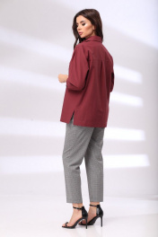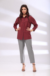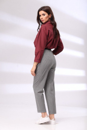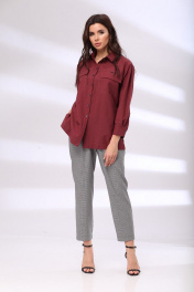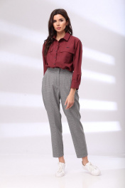 Стильный женский комплект состоит из рубашки и брюк. Рубашка свободного силуэта выполнена из х/б ткани. По переду и спинке отрезные кокетки, в швах кокетки переда обработаны карманы с клапаном. Воротник рубашечный, застежка центральная на петли пуговицы. Рукава втачные длина 7/8 ,по окату и по низу заложена встречная складка, низ оформлен манжетом. Брюки свободного силуэта, зауженные к низу, выполнены из комфортной костюмной ткани. По передним половинкам от талии заложены складки, в боковых швах обработаны наклонные карманы. Застежка на тесьму молния и крючок. Верх обработан притачным поясом, по спинке пояс выполнен из резинки. Длина рубашки 68.5 см Длина рукава 48 см Длина брюк 102см Блузка Длина спинки 68,5 68,5 68,5 68,5 Ширина спинки 42 42 42 42 Ширина изделия на уровне глубины 51 53 55 57 проймы Ширина по линии талии 50 52 54 56 Ширина по линии бедер(низа) 52 54 56 58 Длина рукава 48 48 48 48 Ширина рукава вверху 21 21 22 23 Ширина плеча 15,5 15,5 15,5 15,5