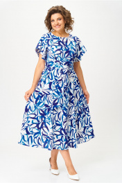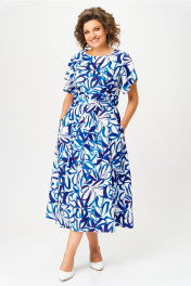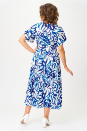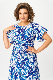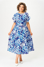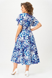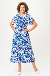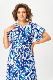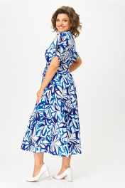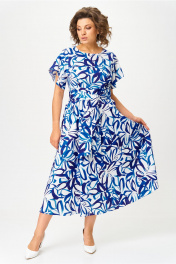 Стильное женское платье, выполнено из хлопчатобумажной ткани с принтом. Платье полуприлегающего силуэта с широкой юбкой, по линии талии втачной широкий пояс. Горловина круглая, по юбке на уровне бедер карманы. Застежка на тесьму молния, в среднем шве спинки, по талии в шов вставлен завязывающийся пояс. Рукава втачные, «крылышко». Платье без подкладки. Длина платья – 125 см Длина рукава – 19 см