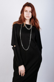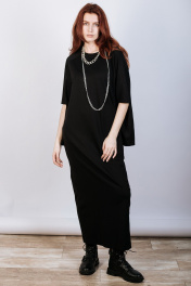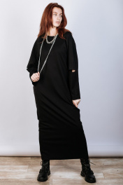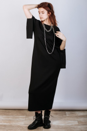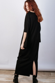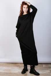 Лаконичное женское платье из вискозного трикотажа. Силуэт прямой, свободный. Разрез по среднему шву спинки. Рукав покроя реглан с разрезом по линии локтя. Горловина круглой формы с обтачкой из основной ткани. Карманы в боковых швах.