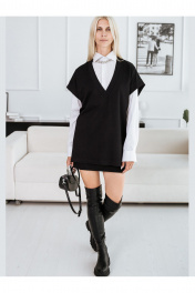 Жилет женский прямого силуэта свободного кроя. V-образный вырез горловины. Изготовлен из эластичного трикотажного полотна, ткань гладкая, плотная, держит форму. Съемный пояс из основной ткани в комплекте. Параметры девушки на фото 174/84-69-94, размер 44-46.