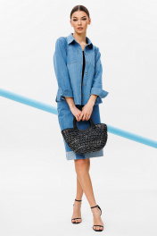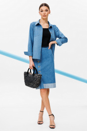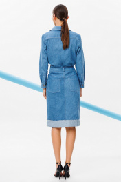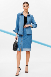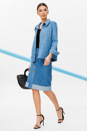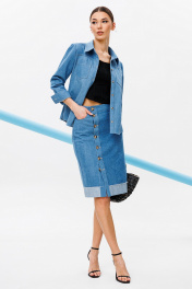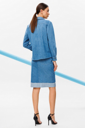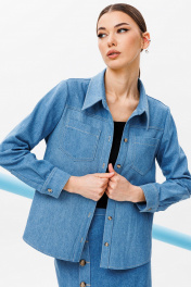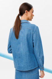 Блузка из джинсовой ткани полуприлегающего силуэта, с втачным одношовным рукавом, внизу со складкой и манжетой, с застежкой на петлю-пуговицу. Полочка с застежкой на петли-пуговицы с кокеткой и с накладными карманами. Спинка с кокеткой и встречной складкой от кокетки. Воротник рубашечный отложной на стойке. Спинка и полочка с фигурным низом. Внизу по боковым швам обработаны разрезы.
