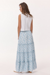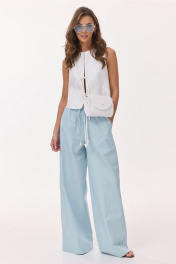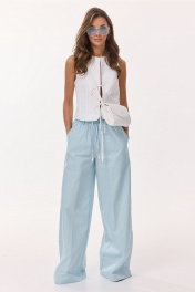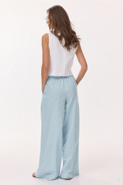 Жилет льняной полуприлегающего силуэта без рукавов. Полочка с центральной застежкой на завязки и крючок, с 2-мя вертикальными вытачками от низа для лучшего прилегания изделия. Спинка с вертикальной вытачкой от низа и центральным швом. Жилет на подкладке из хлопка.