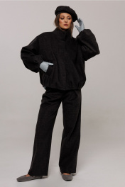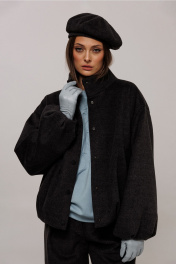 Куртка из пальтовой ткани прямого силуэта со спущенной линией плеча. Рукав втачной одношовнный внизу со складками. Полочка с центральной застежкой на кнопки и карманом-листочкой. Полочка и спинка внизу со складками. По горловине воротник-стойка с застежкой на кнопку. Куртка на подкладке.