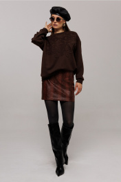 Джемпер из технологичного трикотажного полотна с эффектом peach. Прямого силуэта с втачным рукавом и спущенной линией плеча, с манжетой из основной ткани по низу рукава. По переду вышивка "Орнамент". По горловине и низу изделия притачная планка из основной ткани.