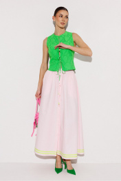 Жилет из ажурного шитья полуприлегающего силуэта без рукавов. Полочка с центральной застежкой на завязки и крючок, с 2-мя вертикальными вытачками от низа для лучшего прилегания изделия. Спинка с вертикальной вытачкой от низа и центральным швом. Жилет на подкладке из хлопка.