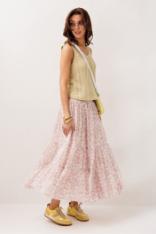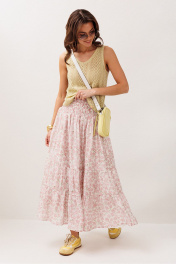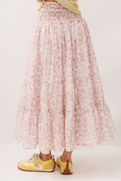 Юбка шифоновая А-силуэта на резинке с притачной кокеткой, которая отстрочена резинками. Юбка с 2-мя притачными слегка присборенными воланами. Юбка на подкладке.
