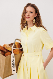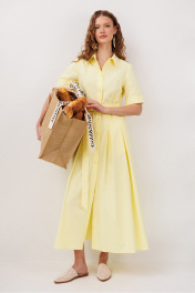 Платье длинное с втачным коротким рукавом до локтя визу на притачной манжете. Полочка с центральной застежкой на петли-пуговицы по притачной планке и с карманами в боковых швах. Платье отрезное по линии талии, лиф с талиевой вытачкой, юбка со встречными складками от талии. Спинка с кокеткой и нашивкой на кокетке. Воротник рубашечный отложной на стойке. Платье без подкладки. Съемный пояс из основной ткани на полукольцах.