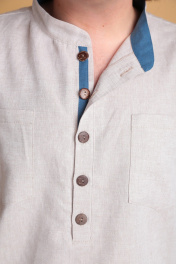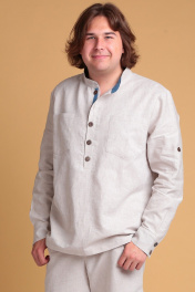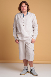 Мужская льняная рубашка от Celentano свободного силуэта. Воротник-стойка, внутренняя часть которой с контрастной отделкой. Застежка на петли и пуговицы, расположенные на планке. На полочке карманы. Спинка рубашки с двойной кокеткой и шлевкой. Внутренняя часть кокетки и шлевка выполнены из контрастной ткани. Рукав одношовный втачной, заканчивается манжетой с застежкой на две петли и пуговицы. Внутренняя часть манжеты контрастная. На рукавах выполнены паты для укорачивания. Длина изделия по спинке 76 см., длина рукава 67 см. Рубашка выполнена из качественного белорусского льняного полотна (пр-во Орша). Ткань не тянется. Все пуговицы натуральные кокосовые. Наша рубашка из натурального льна будет незаменима для повседневного использования прохладным летом или вечером. На фото рубашка с нашими шортами 3020. Также оба изделия можно приобрести костюмом 3029 или скомпоновать ее с брюками 3021.