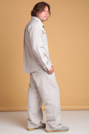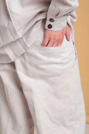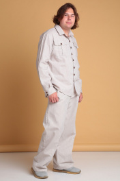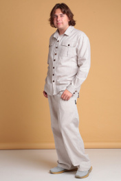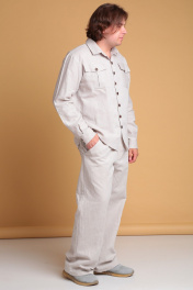 Летний мужской льняной костюм от Celentano, состоящий из рубашки и брюк. Рубашка свободного силуэта. Воротник отложной рубашечный, застежка центральная на петли и пуговицы. На полочке расположены карманы. Спинка рубашки с двойной кокеткой, от которой выполнена встречная складка, в шве кокетки шлевка. Рукав одношовный втачной, заканчивается манжетой с застежкой на две петли и пуговицы. Длина изделия по спинке 74 см., длина рукава 65 см. Брюки широкие. Пояс притачной, застежка на петлю и пуговицу и гульфик с молнией. В боковых швах - карманы ""хулиганы"", сзади - накладные карманы. Длина изделия без учёта пояса по боковому шву 106 см., по шаговому шву 81 см. Костюм выполнен из качественного белорусского льняного полотна (пр-во Орша). Ткань не тянется. Все пуговицы натуральные кокосовые. Наш костюм из натурального льна будет комфортен для повседневного использования теплой весной и летом. Брюки и рубашку можно приобрести раздельно. Модели 3021 и 3023 соответственно.