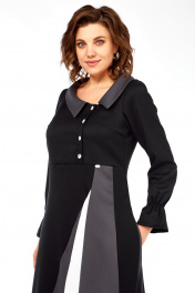 Это платье-ода элегантности движения и архитектурной точности, где каждый элемент продуман до мелочей. Асимметричные диагональные линии и расклешенный подол визуально вытягивают фигуру, делая ее стройнее и изящнее. Вы будете чувствовать себя уверенно и грациозно. Контраст черного, серого и белого создает графический, но не резкий образ, ассиметричные линии и "разрез" на юбке придают платью динамику, словно оно находится в постоянном, но контролируемом движении. Широкий воротник и декоративные пуговицы напоминают о винтажных патьях и шинелях, добавляя нотку ретро-шика и благородства. Забудьте о скучных нарядах! Это платье — произведение искусства, где каждая линия и каждый цвет продуманы, Вы будете ловить восхищенные взгляды, куда бы ни пошли. Техническое описание: Платье миди сложного асимметричного кроя, силуэт полуприлегающий в верхней части, переходящий в расклешенный А-силуэт к низу, создающий эффект удлиненной и струящейся фигуры. Воротник широкий, плоский, отложной, с закругленными краями, выполненный из темно-серой ткани, что придает ему элегантность и слегка винтажный акцент. Лиф приталенный, с застежкой на петли пуговицы. Декоративный ряд контрастных пуговиц, расположенных асимметрично, подчеркивает V-образный вырез и утончает силуэт. Рукава длинные, втачные, с легкой сборкой на манжетах, что добавляет мягкости и женственности. Основная часть низа выполнена из плотной черной ткани. Главная изюминка — асимметричный крой с вертикальными контрастными вставками, создающими эффект интригующего запаха или разреза. Контрастные вставки из черного основания юбки вырываются две широкие клиновидные вставки: одна темно-серая, другая — ярко-белая. Они расположены диагонально, пересекаясь, и создают визуальную игру. Белая вставка имеет выраженный декор в нижней части — три горизонтальные кружевные полоски, что добавляет графичности и уникальности. Спинка цельнокроеная с двумя выточками для лучшего прилегания фигуры, выполнена из основной черной ткани, подчеркивая стройность силуэта. длинаспинки 125смлина рука6см