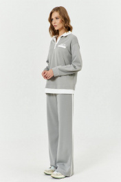 Костюм женский трикотажный, состоящий из джемпера и брюк. Джемпер прямого силуэта с застежкой поло. Планки застежки контрастного цвета; застегиваются на прорезных петли и пуговицы. На левой стороне переда расположена настрочная листочка из трикотажа контрастного цвета и печать над ней. По низу изделия притачана планка контрастного цвета. Воротник стояче-отложной с цельнокроеной стойкой. Воротник из трикотажа контрастного цвета. Рукава втачные, одношовные, длинные с притачной по низу манжетой. Брюки расширенные к низу, с притачным поясом с резинкой. Передние полотнища брюк с боковыми карманами. По бокам- лампасы контрастного цвета.
