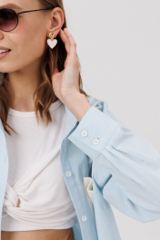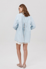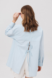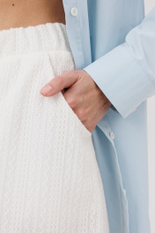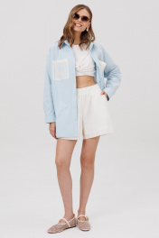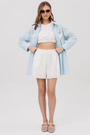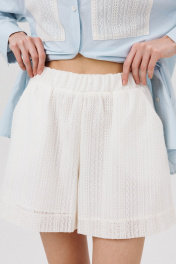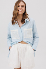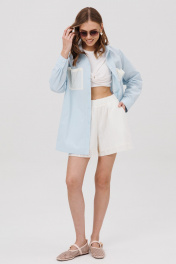 Комплект женский, состоящий из блузки и шорт. Блузка женская прямого силуэта с центральной застежкой с планками, застегивающимися на 8 прорезных петель и пуговиц. Перед - с накладными карманами из ажурной ткани. Спинка - с кокеткой и разрезом, с завязками по разрезу. Рукава рубашечного типа с притачными по низу манжетами, застегивающимися на 2 прорезных петли и пуговицы, с разрезом и складками. Воротник рубашечного типа с отрезной стойкой, застегивающийся на 1 прорезную петлю и пуговицу. Шорты женские свободного прилегания, с притачным поясом на резинке. Шорты выполнены из ажурной ткани, с х/б подкладкой. Передние половинки шорт - с боковыми карманами. Задние половинки без конструктивных элементов.
