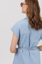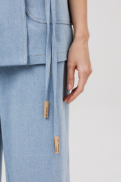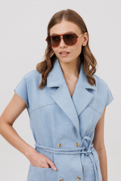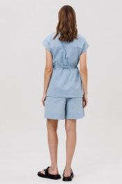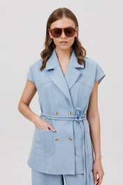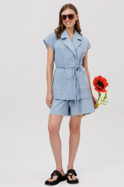 Комплект состоит из жилета и шорт. Жилет прямого силуэта с двубортной застежкой на 2 пары петель и пуговиц. Перед - с отрезной кокеткой, с рельефом от кокетки до низа, с накладными карманами. Спинка с кокеткой и рельефами от кокетки до низа. Воротник пиджачного типа с отложными лацканами. В комплекте – пояс шнур выполненный из джинса. Шорты расширенные книзу, с застежкой на тесьму молнию с гульфиком и откоском, с притачным поясом, со шлевками. Передние половинки шорт с карманами. По левому боку - с дополнительным накладным мини-кармашком и хольнитенами по бокам накладного кармашка и по фигурному карману у боковых швов и пояса. Задние половинки шорт – с кокетками и накладными карманами. Шорты по низу - с необработанным краем.