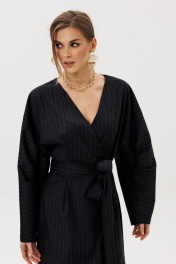 Платье - женское, прилегающего силуэта, “на запах”, застегивающееся на 2 петли и пуговицы. Перед - отрезной по линии талии, со складками. Спинка со складками. Рукава отрезные на основе цельнокроеного рукава, с 3-мя складками от нижнего шва. Вырез горловины-V-образный.