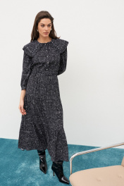 Платье отрезное по талии длиной 120 см с эластичной тесьмой. Застежка центральная по переду на петли и пуговицы. Юбка с широкими оборками. Втачной рукав со сборкой по окату и узкой манжетой по низу длиной 50 см. Воротник плосколежащий «Питер Пэн» с рюшей и клеевыми стразами.