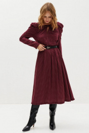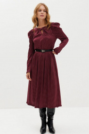 Платье-миди отрезное по талии длиной 113,0 см, с объемными рукавами по окатам длиной 65,0 см. Лиф присборен в виде банта с разрезом в среднем шве. Юбка со складками. Низа рукавов и юбки с рюшами. Спинка со средним швом и застежкой на потайную тесьму-молнию. Съемный пояс в комплекте