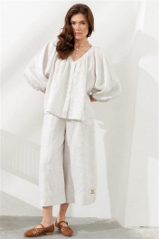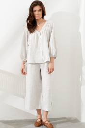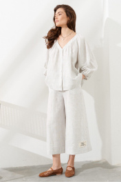 Льняная блузка свободного силуэта, длина по спинке 63 см. Задняя часть изделия удлиненная, передняя укороченная. По верхнему срезу заложены мягкие равномерные сборки. Горловина и срезы полочки обработаны планкой. Рукав реглан, собран на резинку у нижнего края. Центральная застежка на петли и пуговицы. Низ блузки закругленной формы.