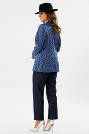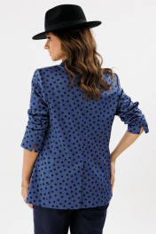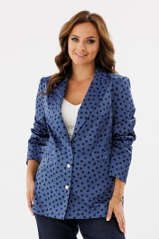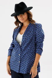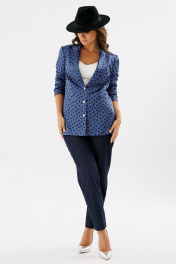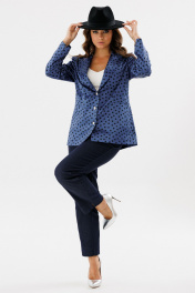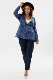 Двубортный жакет полуприлегающего силуэта, ткань хлопок сатин. По переду обработаны прорезные карманы с листочкой. Отложной воротник с лацканами. Рукав втачной длинный с разрезами по низу рукава. Спинка жакета со шлицой. Жакет без подкладки. Украшением данной модели являются стильные пуговицы. Длина жакета по спинке 67см., длина рукава 61,5см.