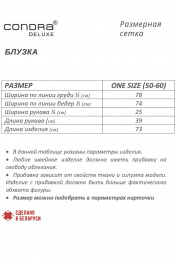 Блузка one size прямого силуэта со спущенным плечом. Рукав укороченный с «патой». Центральная застежка на петли-пуговицы. Воротник отложной с отрезной стойкой. По переду накладной карман в области груди. По боковым швам разрезы от линии талии. Размер one size (50-60).