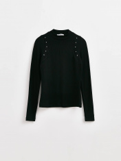 Джемпер из мягкого полотна с вискозой в рубчик создан, чтобы стать лаконичной основой ваших базовых образов. Модель легко сочетается с денимом, брюками и юбками. · невысокий воротник-стойка· длинные рукава· прилегающий силуэт· мягкий эластичный трикотаж с высоким содержанием вискозы· в рубчик· вставки с декоративными хольнитенами в области плеч · комфортная основа для ваших повседневных образов.