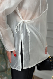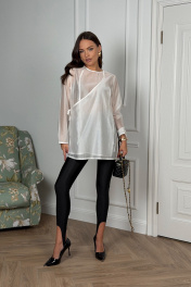 Блузка женская , свободного силуэта . Выполнена из блузочной вискозной вуали высокого качества .Рукав втачной одношовный , горловина круглая , с каплевидным вырезом . Блузка застегивается на запах , фиксируется в области талии на завязки из основной ткани .