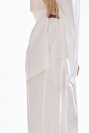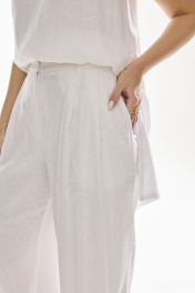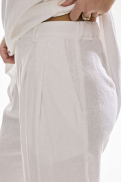 Брюки свободного силуэта . Выполнены из качественного смесового льна . Верх брюк обработан притачным поясом с резинкой , застежка в виде молнии , по переду брюк функциональные боковые карманы и складки .