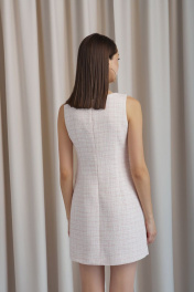 Платье из мягкой костюмной ткани «рогожка», длиной выше линии колена, полуприлегающего силуэта. Перед с нагрудными и талиевыми вытачками, с накладными карманами, расположенными ниже линии талии. Карманы со скруглёнными концами и застёжкой на петлю пуговицу. Спинка с талиевыми вытачками, с застёжкой на потайную тесьму-молнию в среднем шве. Платье без рукавов. Горловина округлой формы, углублена по переду. Платье на подкладке.