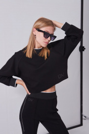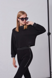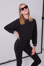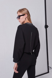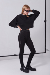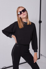 Костюм женский в спортивном стиле из плотного трикотажного полотна, состоящий из джемпера и брюк. Джемпер свободного кроя «оверсайз», прямого силуэта, длиной до линии талии. Рукава-реглан, длиной до запястья, с притачными манжетами из отделочной тесьмы. Деталь переда с печатью в виде логотипа, расположенного внизу слева. Спинка с металлической тесьмой от низа до уровня лопаток, в среднем шве. Над молнией пришивной лейбл. Горловина округлой формы с притачной планкой из отделочной тесьмы. Брюки с посадкой на талии, прилегающего силуэта, длиной выше щиколотки, на широком притачном поясе из отделочной тесьмы. По центру передних половинок застрочены стрелки, на правой половинке вверху, печать в виде логотипа. Детали спинки без особенностей. По боковым швам, от талии до середины бедра расположены металлические молнии.