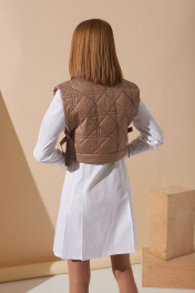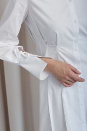 Платье из рубашечного хлопка, полуприлегающего силуэта, расширено от талии к низу, длиной выше линии колена, с рубашечным воротником на притачной стойке и рукавами, длиной до запястья. Детали переда и спинка с двумя парами вертикально застроченных и заутюженных до низа складок, расположенными на уровне талии, рёбра которых направлены в сторону боковых швов. Рукава с тремя парами складок по шву притачивания манжет. Разрез рукавов окантован, манжеты с застёжкой на две петли и отделочные пуговицы, расположенные на прямоугольном уступе. Боковые стороны манжет расходятся от уровня застёжки. Низ платья прямой, застрочен отделочной строчкой. Застёжка центральная, на петли и пуговицы на цельнокроёной планке и на отделочную пуговицу на стойке.