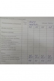 Юбка из плотного трикотажного полотна, А- силуэта с посадкой на талии, длиной выше линии колена. Перед с металлическими молниями в диагональных рельефах, с настрочными фигурными клапанами на уровне бёдер, переходящими со спинки на перед, вниз к центру. По центру клапанов декоративные пуговицы. Спинка с отрезным поясом-обтачкой с застёжкой на потайную тесьму-молнию в среднем шве и на две петли и пуговицы на обтачке. Юбка на подкладке.