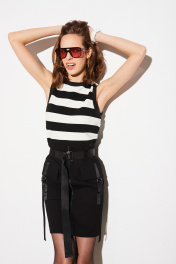 Юбка из плотного трикотажного полотна, прилегающего силуэта, с посадкой на талии, длиной выше линии колена. Перед с центральной застёжкой на декоративную молнию, с накладными прямоугольными карманами и клапанами на уровне бёдер. Спинка без особенностей. По клапанам, карманам и вдоль молнии прострочены широкие отделочные строчки. Юбка без пояса, со сгибом по верхнему караю. Чуть ниже верхнего края юбки, отстрочена кулиса с эластичной тесьмой, которая создаёт лёгкую драпировку по верхнему краю. По центру клапанов и карманов настрочена отделочная тесьма и полукольца. Через шлёвки, на уровне кулисы, втянут пояс из отделочной тесьмы с пряжкой полукольца. Юбка без подкладки.