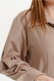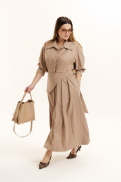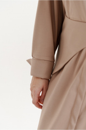 Платье женское приталенного силуэта из костюмной ткани. Вырез горловины оформлен воротником рубашечного типа. Застежка - потайная на петли с пуговицами. Рукава - втачные с мягкой складкой в области оката. Низа посажены на отрезные манжеты с застежкой на петли с пуговицами. Отрезное по линии талии. В боковых швах имеются карманы. Справа выполнен разрез, слева - складки. Изделие декорировано съемной баской.