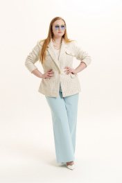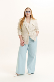 Костюм женский двухпредметный выполнен из ткани двух видов (твид и джинс). Жакет прямого силуэта на подкладке. Вырез горловины оформлен воротником пиджачного типа с застежкой на петли и пуговицы. Рукава - втачные двухшовные с плечевыми накладками. На полочке обработаны прорезные карманы с клапанами и отделочный элемент в виде клапанов. Изделие декорировано золотыми пуговицами. Брюки - прямые. Пояс - отрезной с застежкой на молнию и петлю с пуговицей и частично на резинке. Имеются карманы с отрезными бочками и шлевки для ремня. На заднем полотнище обработаны кокетки и накладные карманы. Отделочная фурнитура может меняться.