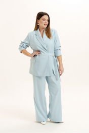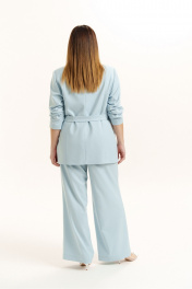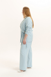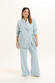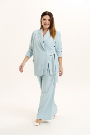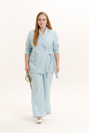 Костюм женский двухпредметный выполнен из костюмной ткани премиум класса, жакет на подкладке. Универсальный классический жакет прямого силуэта, вырез горловины оформлен воротником пиджачного типа превосходно садится по фигуре, на правой полочке обработан прорезной карман в рамку с клапаном и имитация прорезного кармана с клапаном, на левой шлица, застежка обработана на отлетном хлястике, на петлю и пуговицу. Рукава - втачные двухшовные с плечевыми накладками. Спинка жакета с средним швом и рельефами. Брюки - прямые. Пояс - отрезной, на резинке по кругу. Имеются карманы с отрезными бочками и шлевки для ремня. Низ брюк обработан швом в подгибку с закрытым срезом. Отделочная фурнитура может меняться.