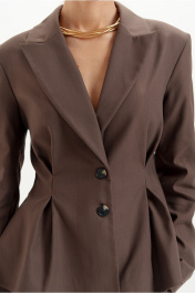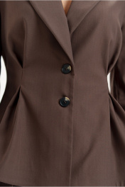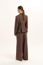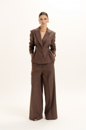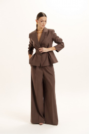 Костюм женский двухпредметный. Жакет - приталенного силуэта с мягкими складками в области талии на подкладке. Вырез горловины оформлен воротником пиджачного типа с двубортной застежкой застежкой на петли с пуговицами. Рукава - втачные двухшовные с плечевыми накладками. Брюки - палаццо со стрелками. Пояс - отрезной с застежкой на молнию и петлю с пуговицей, частично вставлена эластичная тесьма. Имеются карманы с отрезными бочками и шлевки для ремня. Изделие декорировано авторской брошью.