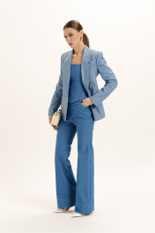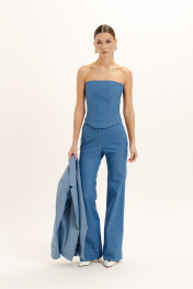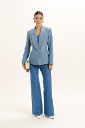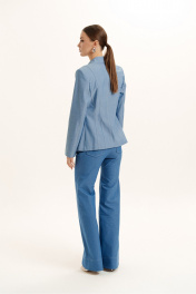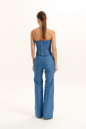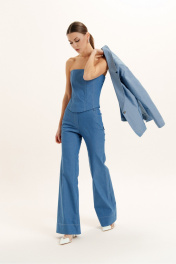 Комплект женский трехпредметный. Состоит из жакета, корсета на х/б подкладке и брюк. Выполнен из джинсовой ткани. Жакет без подкладки с пиджачным воротником и лацканами, обработаны накладные карманы по переду жакет и декорирован отделочными строчками по рельефам. Застежка на петлю и пуговицу. Корсет без лямок, с открытым верхом, застежка по спинке изделия на молнию, корсет утягивает талию и корректирует фигуру. Брюки - клеш от колена. Пояс - отрезной, с закрытым срезом по кругу, застежка на молнию и петлю и пуговицу. Имеются карманы с отрезными бочками по переду и накладные карманы по спинке, и шлевки для ремня. Низ брюк обработан швом в подгибку с закрытым срезом.