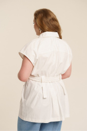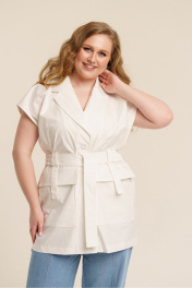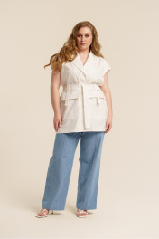 Жилет женский свободного покроя из плотной хлопковой ткани. Вырез горловины оформлен отложным воротником с лацканами. Застежка- однобортная на петли с пуговицами. В области груди - настрочные клапаны. Имеются накладные карманы с клапанами. Изделие дополнено съемным поясом из основной ткани с эластичной тесьмой по спинке, который продевается в шлевки, переходящие в паты. Длина спинки от линии горловины - 78 см.