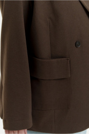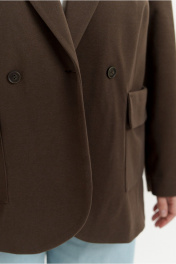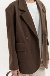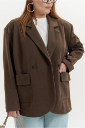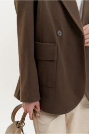 Жакет прямого покроя из мягкого трикотажного полотна. Вырез горловины оформлен воротником пиджачного типа с двубортной застежкой на петли с пуговицами. Рукава - втачные с расширенной линией плеча. Усилены плечевыми накладками. На передних половинках - настрочные карманы с цельнокроеными отворотами, имитирующими клапаны. Перед изделия посажен на подкладку.