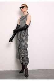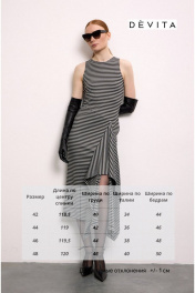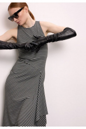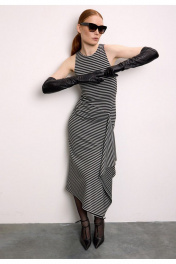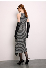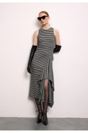 Платье из премиального трикотажного полотна в полоску без рукава. Прямой силуэт, длиной ниже колен и округлой горловиной, обработанной контрастной черной бейкой. Спереди - фигурный подрез с драпированной деталью.