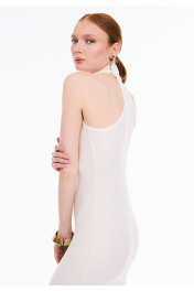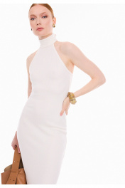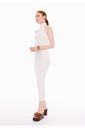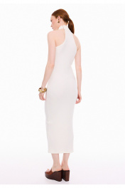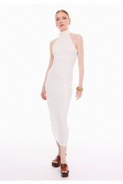Платье женское прилегающего силуэта, из трикотажного полотна в рубчик "лапша". Платье без рукавов, с английской проймой, обработанной бейкой и воротником стойкой. Стойка застёгивается на три петли и пуговицы. Платье длиной ниже линии колен, вытягивает и подчеркивает женственный силуэт, создавая утонченный образ.