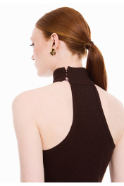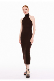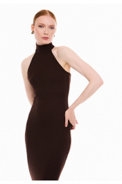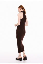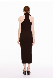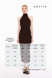 Платье женское прилегающего силуэта, из трикотажного полотна в рубчик "лапша". Платье без рукавов, с английской проймой, обработанной бейкой и воротником стойкой. Стойка застёгивается на три петли и пуговицы. Платье длиной ниже линии колен, вытягивает и подчеркивает женственный силуэт, создавая утонченный образ.