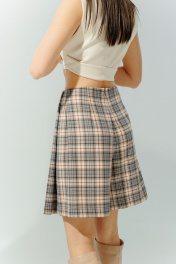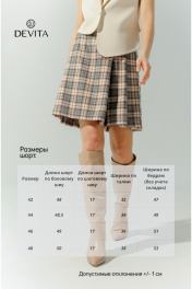 Шорты женские из костюмной вискозной ткани премиум класса. Великолепно садятся на фигуру, благодаря отточенным лекалам и визуально вытягивают силуэт. Шорты в клетку с конструктивной ассиметрией детали переда. Складки визуально создают эффект юбки. Шорты на талии, свободного кроя. Верхний край шорт обработан обтачкой. По переду заложены четыре складки, одна по правой стороне в направлении бокового шва и три по левой части переда в направлении бокового шва. На задних частях шорт обработаны по одной вытачки на каждой половине. По среднему шву вставлена потайная молния, имеются боковые карманы. Статусная вещь с различными вариантами стилизации и комплектации с изделиями бренда DEVITA. Измерения готового изделия расположены в табличке с фотографиями. Уход за изделием: Бережная стирка при максимальной температуре 30ºС, Не отбеливать, Машинная сушка запрещена, Вертикальная сушка; Глажение при максимальной температуре 110ºС без пара, Профессиональная чистка - мягкий режим.