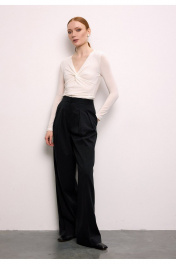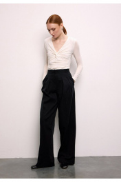 Свободные брюки премиум-класса сочетают в себе утонченный стиль и непревзойденный комфорт. Модель с высокой посадкой на талии подчеркивает силуэт, а свободный крой обеспечивает легкость движений. Притачной пояс с застежкой на два крючка и потайную кнопку создает идеальную посадку. Изящные односторонние складочки по линии талии спереди добавляют модели элегантности, а фигурные вытачки сзади обеспечивают безупречную посадку по фигуре. Боковые карманы, аккуратно встроенные в швы, и стильные прорезные карманы с листочками сзади делают эти брюки не только красивыми, но и практичными. Премиальная обработка всех швов и внимание к каждой детали подчеркивают высокое качество этой модели. Универсальная длина позволяет создавать разнообразные образы - от строгого офисного до повседневного городского. Эти брюки станут любимой вещью в вашем гардеробе, даря комфорт и уверенность в каждом движении.