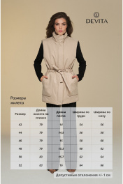 Тёплый удлиненный женский жилет на подкладке с высокой стойкой. Силуэт прямой, с регулировкой по талии в виде кулисы с поясом. Расширенная линия плеча. Застёжка на молнию с защитной планкой и кнопками. Эргономичные накладные карманы с боковым входом. Утеплитель ISOSOFT плотностью 150 г/м². Бархатистая ткань с защитной пропиткой позволит носить жилет в холодную сырую погоду, а свободный крой предполагает использовать его даже поверх жакетов, лёгких пальто или плащей. Статусная вещь с различными вариантами стилизации и комплектации с изделиями бренда DEVITA. Измерения готового изделия расположены в табличке с фотографиями.